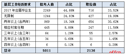 本次招錄中明確要求只有2017年應屆畢業(yè)生可以報考的職位有716個,不限制基層工作經(jīng)歷的職位有427個,這些職位應屆生均可報考,占總職位數(shù)的53.51%,要求兩年基層工作經(jīng)歷的職位有654個,占總職位數(shù)的30.62%,大學生村官需計算一下自己的任期是否已滿,某些定向招錄大學生村官的職位還需具備一定的專業(yè)技能,比如北京市西城區(qū)人民法院綜合行政部門的一個職位除了要求考生是2017年北京地區(qū)服務期滿的大學生村官外,還必須取得會計從業(yè)資格證書,因此,選職位時考生一定要仔細。