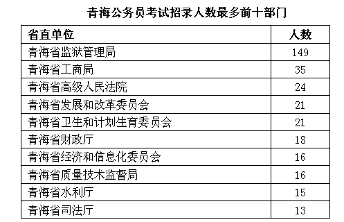 本次青海省共有43個(gè)省直部門面向社會公開招錄公務(wù)員,招錄人數(shù)大相徑庭,其中青海省監(jiān)獄管理局以招錄149人奪得第一寶座,達(dá)到位居第二的工商局的三倍之多,符合條件的考生們可以重點(diǎn)考慮一下這個(gè)部門。