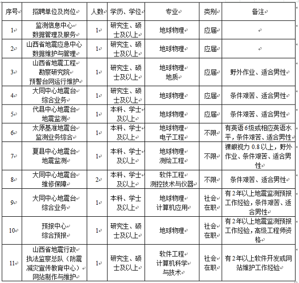 2018山西省地震局所屬事業(yè)單位招聘職位表