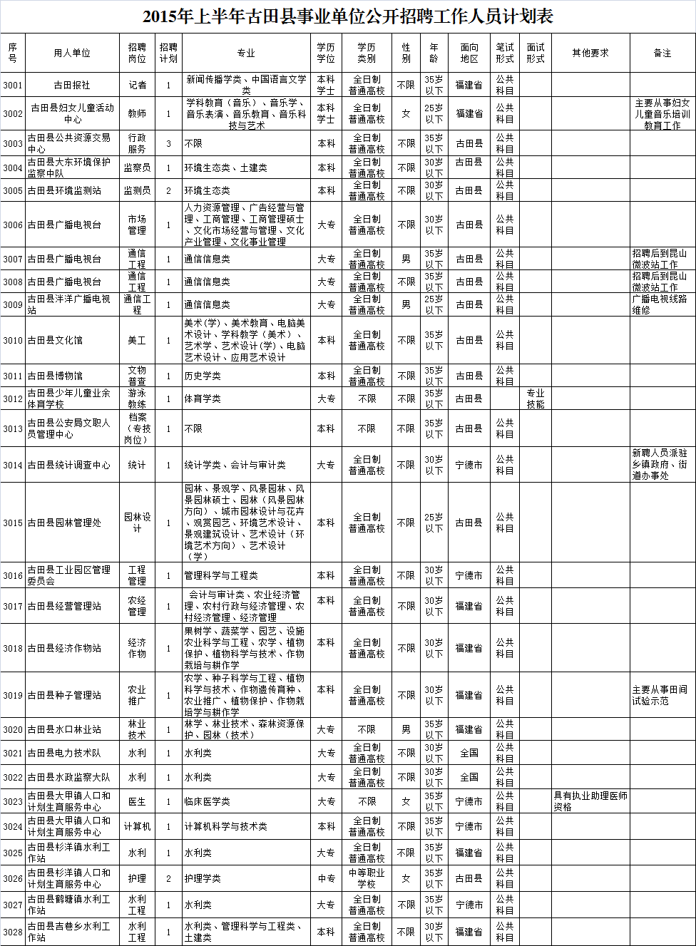 2015年上半年福建省寧德古田事業(yè)單位招聘崗位表