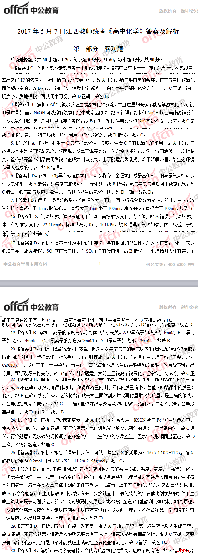 2017年江西教師招聘《高中化學(xué)》試題答案及解析