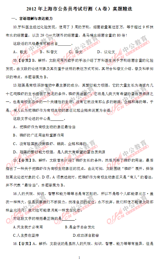 2012年上海市公務(wù)員考試行測(A卷)部分及答案解析