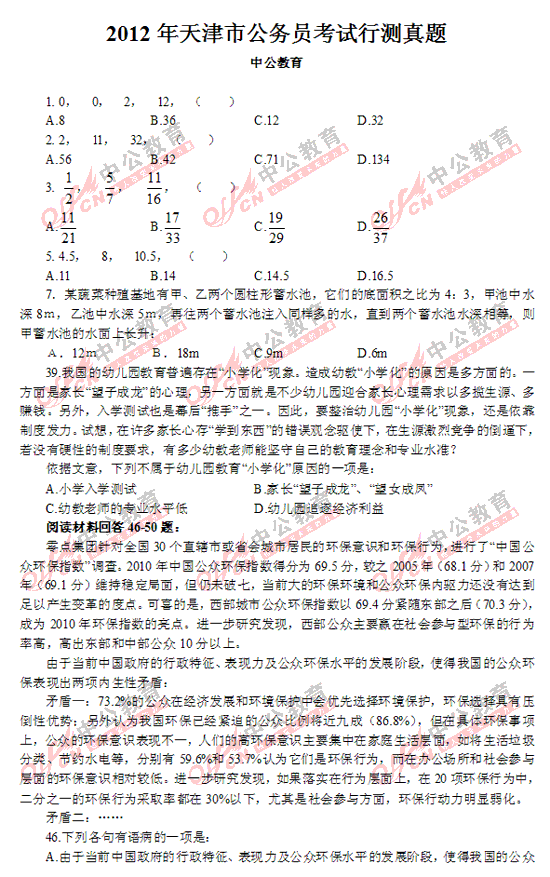2012年天津市公務(wù)員考試行測