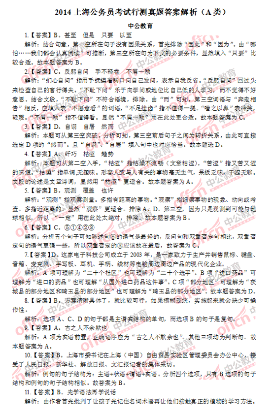 2014上海市公務(wù)員考試行測(cè)答案解析(A類(lèi))