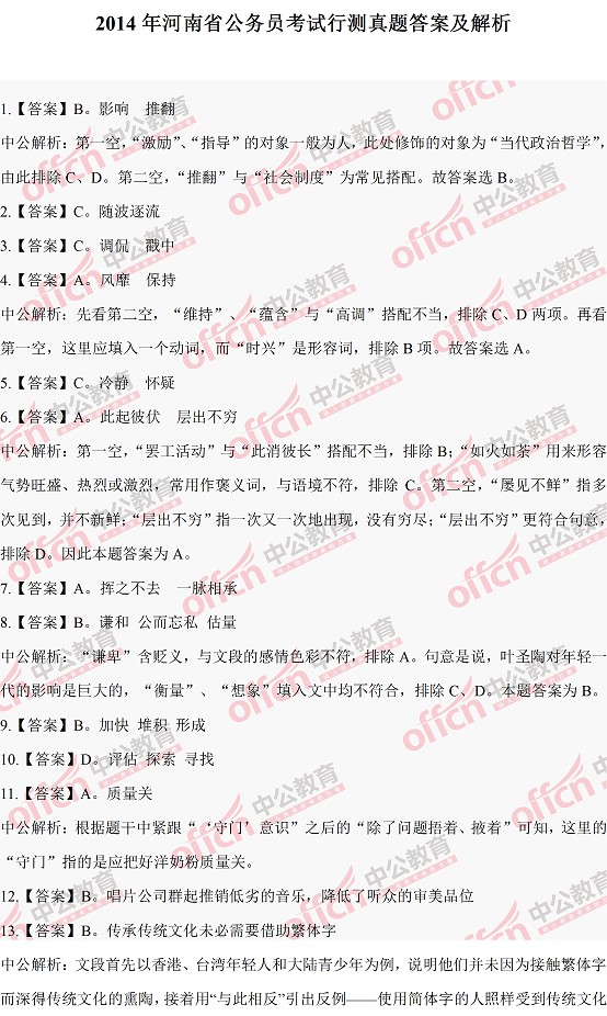 2014年河南公務(wù)員考試結(jié)束后,中公網(wǎng)校會(huì)第一時(shí)間發(fā)布河南公務(wù)員考試行測 答案,考生還可關(guān)注2014年河南公務(wù)員筆試 匯總專題。